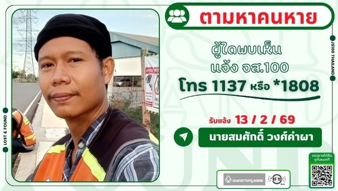 คนหายจากหอพักบริษัทสยามคาสเทคฯ อ.เมือง จ.สมุทรสาคร ผู้ใดพบเห็นแจ้ง JS100 โทร *1808 หรือ 1137