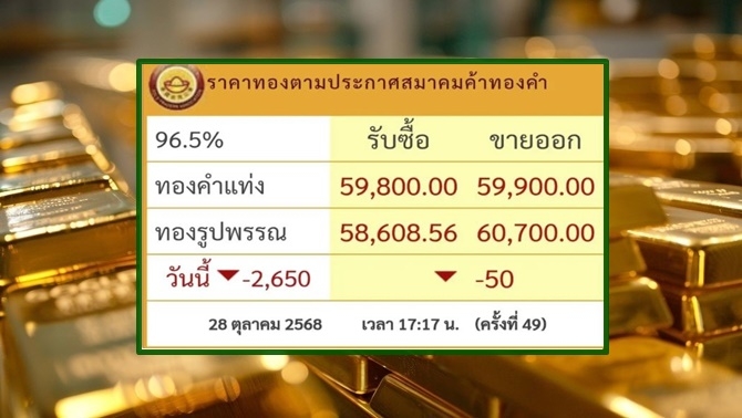 ทองปรับฐานต่อ ปิดตลาดเมื่อวานนี้ ร่วง 2,650 บาท