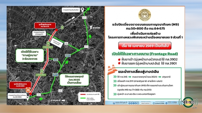 กรมทางหลวงลุยสร้าง M9 วงแหวนตะวันตก ส่วนที่ 1 บางบัวทอง – ลาดหลุมแก้ว เริ่ม 18 เม.ย. 69 นี้ แจ้งปรับการจราจรไปใช้ช่องทางขนานทั้งหมด เพื่อก่อสร้างทางหลักเป็นมาตรฐานมอเตอร์เวย์