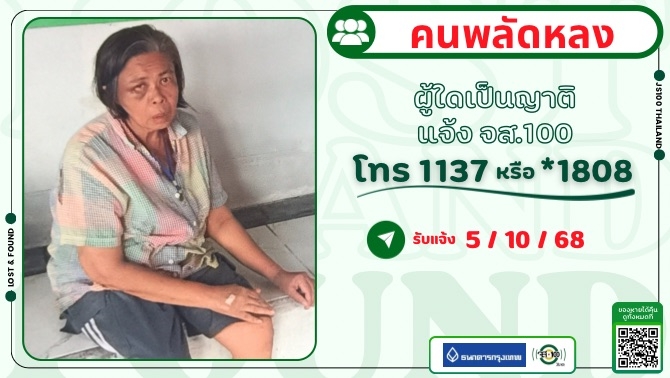 คนหาย ผู้ใดพบเห็นแจ้ง JS100 โทร *1808 หรือ 1137