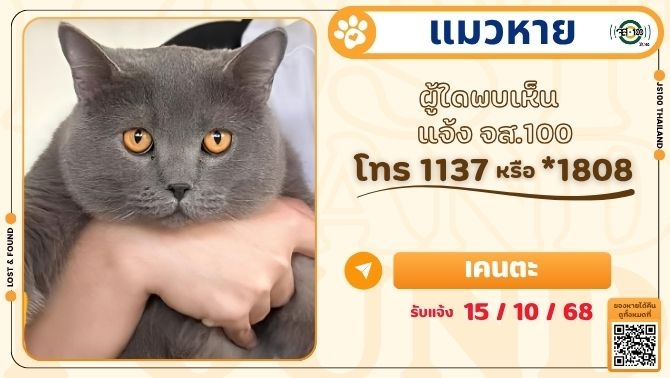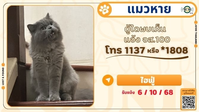 แมวหายจากหมู่บ้านเพอร์เฟคพาร์ค ซ.เคหะร่มเกล้า 64 เขตลาดกระบัง ผู้ใดพบเห็นแจ้ง JS100 โทร *1808 หรือ 1137