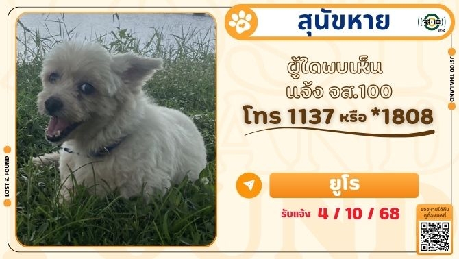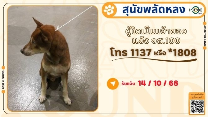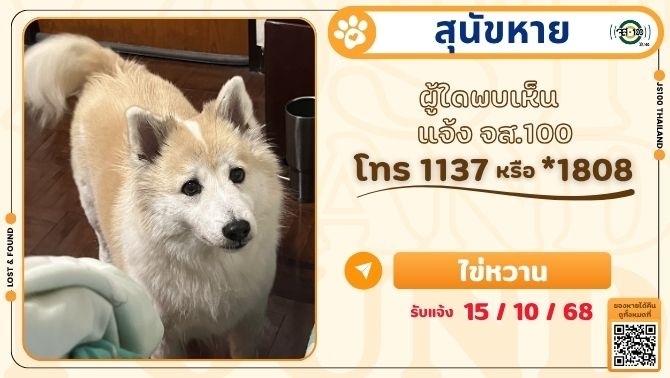 พบสุนัขพลัดหลงที่บริเวณเซ็นทรัลอีสต์วิลล์ ถ.ประดิษฐ์มนูธรรม เขตลาดพร้าว ผู้ใดเป็นเจ้าของแจ้ง JS100 โทร *1808 หรือ 1137