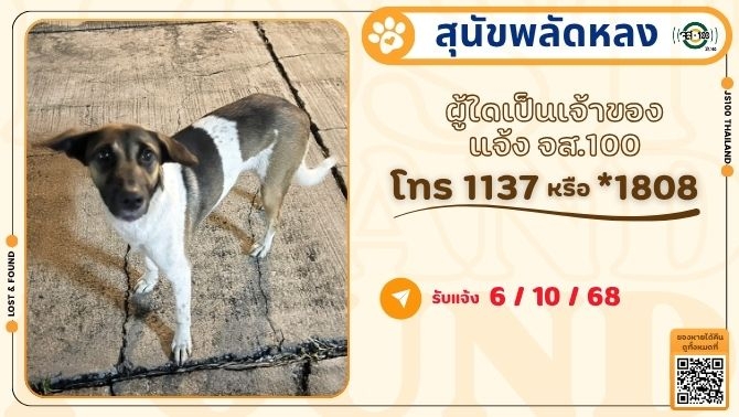 พบสุนัขพลัดหลง ที่บริเวณไทวัสดุ สาขาบางนา อ.บางพลี จ.สมุทรปราการ ผู้ใดเป็นเจ้าของแจ้ง JS100 โทร *1808 หรือ 1137