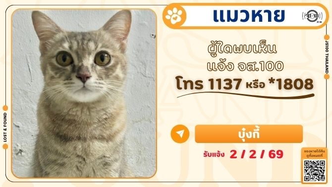 พบแมวพลัดหลงที่บริเวณโรงงาน บ.ลีเดอสัน เมดดิเคิล แพรกษาใหม่ จ.สมุทรปราการ ผู้ใดเป็นเจ้าของแจ้ง JS100 โทร *1808 หรือ 1137