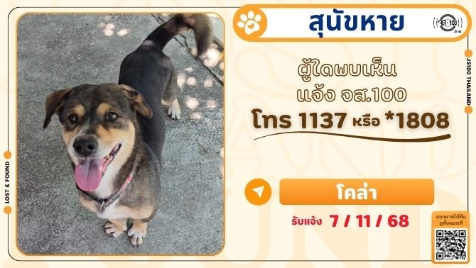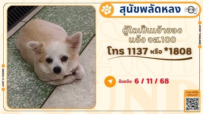 พบสุนัขพลัดหลงที่บริเวณซ.นาคนิวาส 21 เขตลาดพร้าว ผู้ใดเป็นเจ้าของแจ้ง JS100 โทร *1808 หรือ 1137