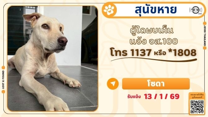 พบสุนัขพลัดหลงที่บริเวณหมู่บ้านคาซ่า ถ.ไทยรามัน เขตคลองสามวา ผู้ใดเป็นเจ้าของแจ้ง JS100 โทร *1808 หรือ 1137