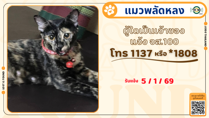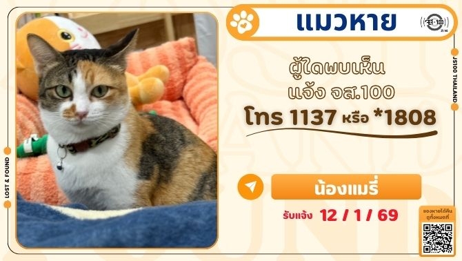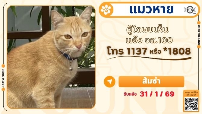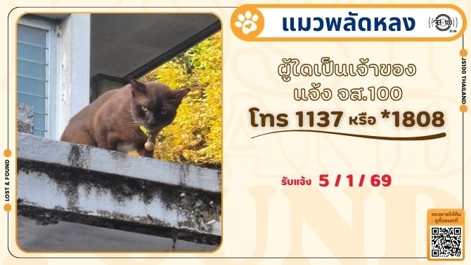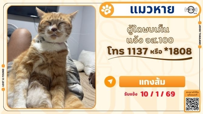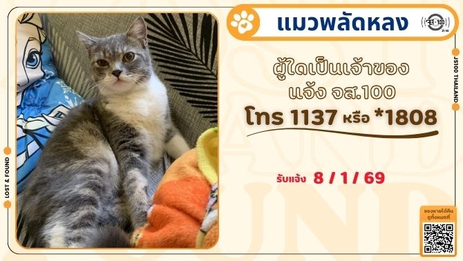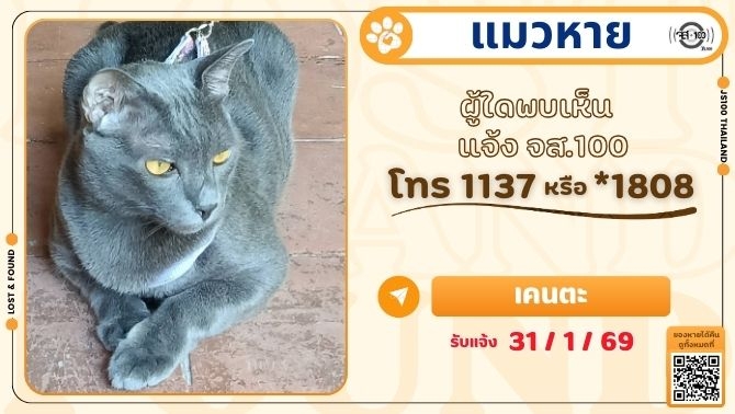 พบแมวพลัดหลงที่บริเวณวัดพระงาม จ.นครปฐม ผู้ใดเป็นเจ้าของแจ้ง JS100 โทร *1808 หรือ 1137
