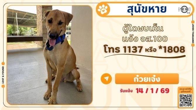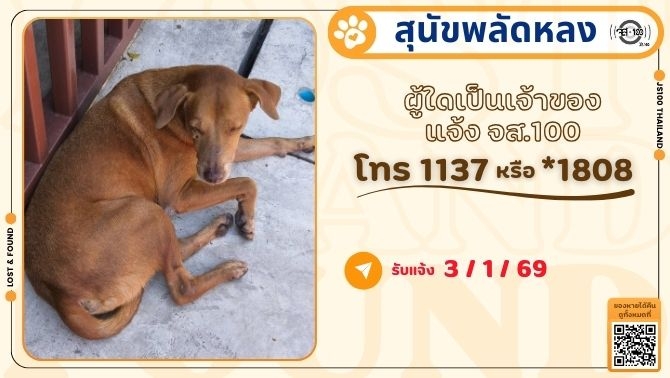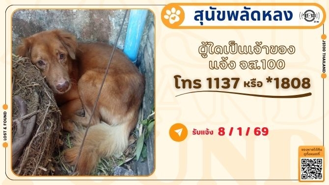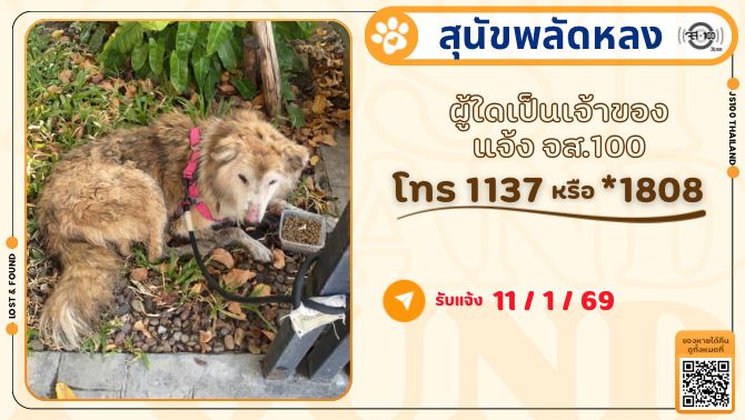 พบสุนัขพลัดหลง ที่บริเวณแยกจอมทอง ถ.วุฒากาศ เขตจอมทอง ผู้ใดเป็นเจ้าของแจ้ง JS100 โทร *1808 หรือ 1137