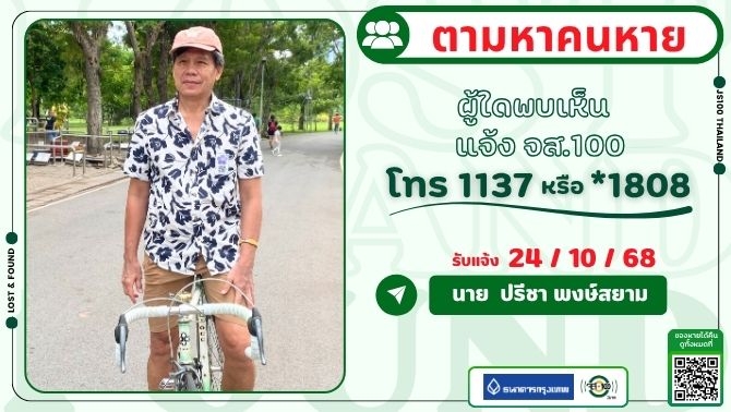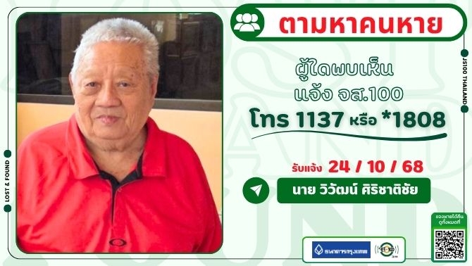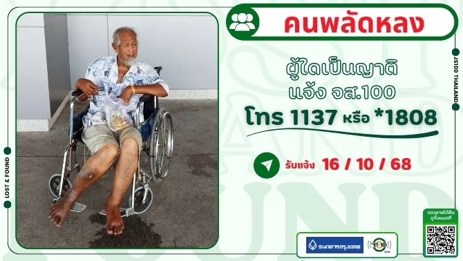 พบคนพลัดหลงมีอาการหลงลืม ที่บริเวณสถานีกลางกรุงเทพอภิวัฒน์ เขตจตุจักร ผู้ใดเป็นญาติแจ้ง JS100 โทร *1808 หรือ 1137
