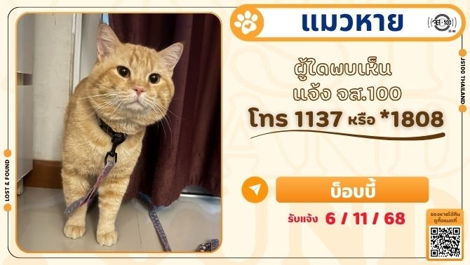 พบสุนัขพลัดหลงที่บริเวณลานจอดรถโลตัสสุขาภิบาล 3 เขตมีนบุรี ผู้ใดเป็นเจ้าของแจ้ง JS100 โทร *1808 หรือ 1137