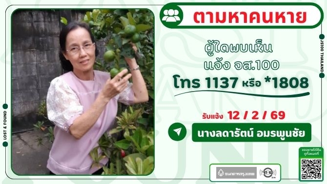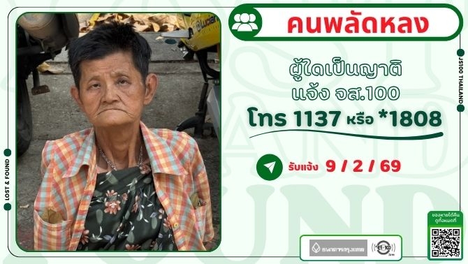 หญิงชรามีอาการหลงลืม หายจากซอยลาดพร้าว 41 แยก 22 เขตจตุจักร ผู้ใดพบเห็นแจ้ง JS100 โทร *1808 หรือ 1137