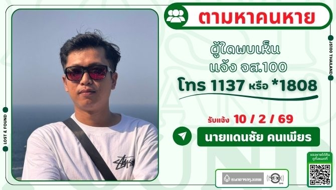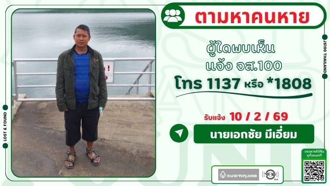 คนหายมีอาการทางจิตเวช หายจากบ้านบริเวณ ถ.ริมทางรถไฟสายแปดริ้ว พญาไท ผู้ใดพบเห็นแจ้ง JS100 โทร *1808 หรือ 1137