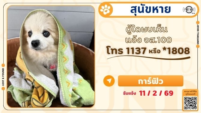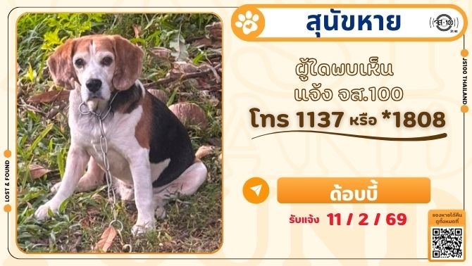 สุนัขหายจากบ้าน อ.สามพราน จ.นครปฐม ผู้ใดพบเห็นแจ้ง JS100 โทร *1808 หรือ 1137