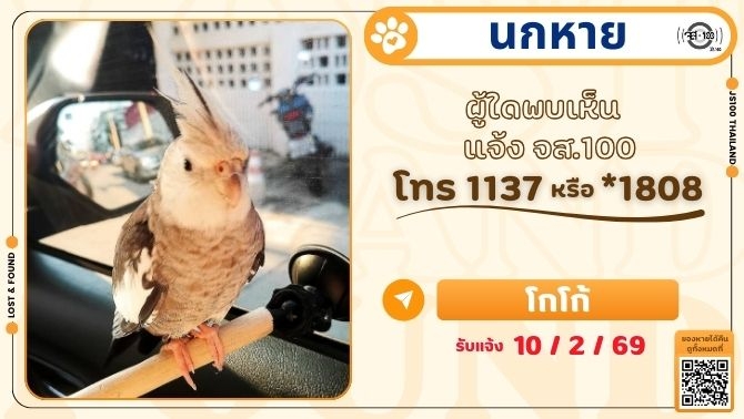 นกหายจากหมู่บ้านพฤกษา 74/3 อเวนิว ศรีนครินทร์-เทพารักษ์ จ.สมุทรปราการ ผู้ใดพบเห็นแจ้ง JS100 โทร *1808 หรือ 1137