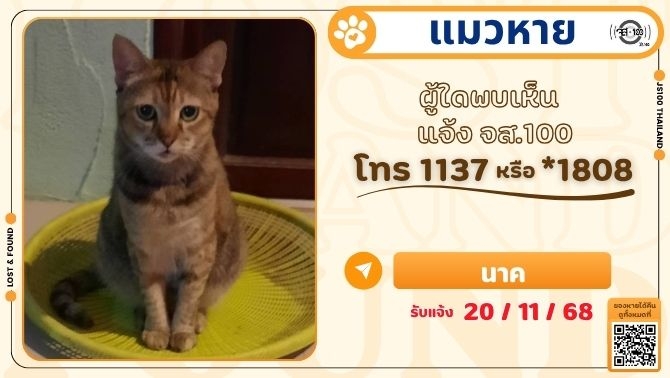 แมวหายจากหมู่บ้านสุวงศ์ชัยวิลล่า ต.บางพูด อ.ปากเกร็ด จ.นนทบุรี ผู้ใดพบเห็นแจ้ง JS100 โทร *1808 หรือ 1137