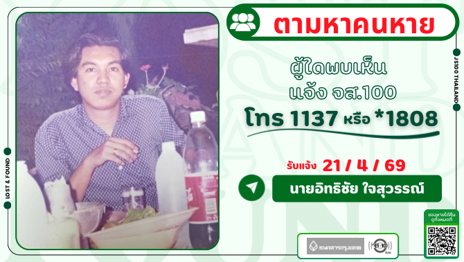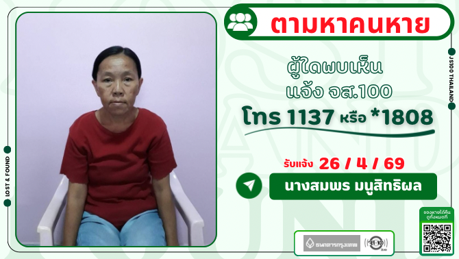 คนหายมีอาการหลงลืม หายจากบ้านซ.ริมคลองวัดสังเวชวิศยาราม เขตพระนคร ผู้ใดพบเห็นแจ้ง JS100 โทร *1808 หรือ 1137