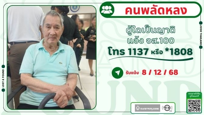 คนหายมีอาการหลงลืม หายจากบ้านซ.ประชาราษฎร์ 8 อ.เมือง จ.นนทบุรี ผู้ใดพบเห็นแจ้ง JS100 โทร *1808 หรือ 1137