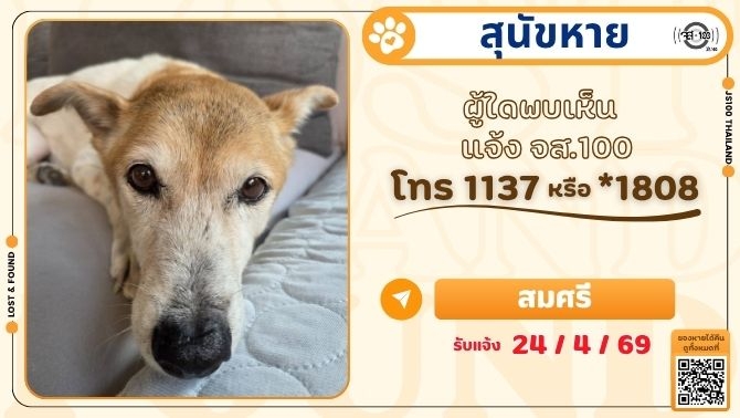 สุนัขหายจากบ้าน ซ.สุขสวัสดิ์ 68 อ.พระประแดง จ.สมุทรปราการ ผู้ใดพบเห็นแจ้ง JS100 โทร *1808 หรือ 1137