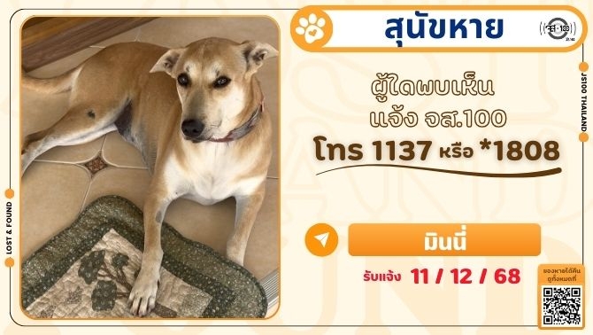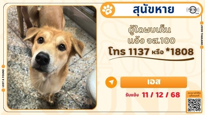 สุนัขหายจากบ้านรับฝากเลี้ยง ใกล้โรงเรียนนานาชาติ เกรซอินเตอร์เนชั่นแนล เชียงใหม่ ผู้ใดพบเห็นแจ้ง JS100 โทร *1808 หรือ 1137