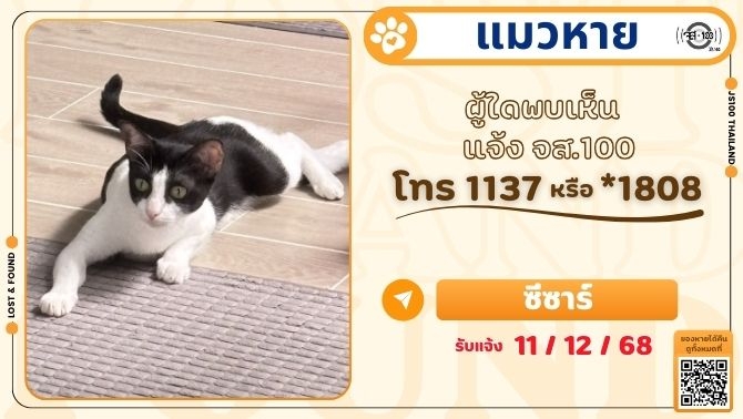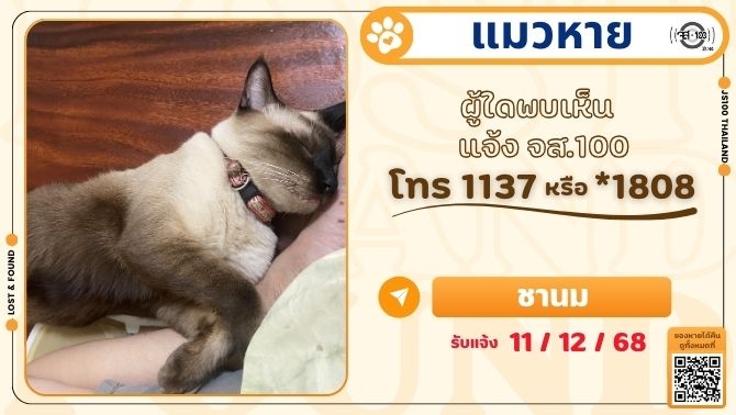 แมวหายจากหมู่บ้านพฤกษาวิลเลจ7 ต.นาเกลือ อ.พระสมุทรเจดีย์ จ.สมุทรปราการ ผู้ใดพบเห็นแจ้ง JS100 โทร *1808 หรือ 1137