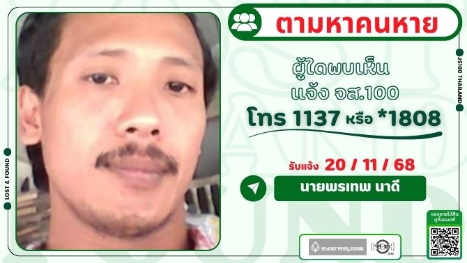 คนหายมีอาการหลงลืม หายจากซอยกันตนา อ.บางใหญ่ จ.นนทบุรี ผู้ใดพบเห็นแจ้ง JS100 โทร *1808 หรือ 1137
