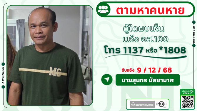 คนหายจากบริเวณรองเมือง เขตปทุมวัน ผู้ใดพบเห็นแจ้ง JS100 โทร *1808 หรือ 1137