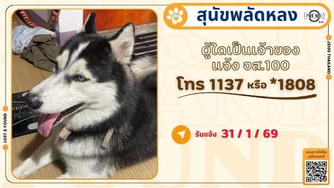 พบสุนัขพลัดหลงที่บริเวณแฟลตตำรวจ ตึก 4 บชน. ผู้ใดเป็นเจ้าของแจ้ง JS100 โทร *1808 หรือ 1137