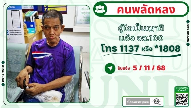 พบคนพลัดหลงมีอาการหลงลืม ที่บริเวณสถานีกลางกรุงเทพอภิวัฒน์ เขตจตุจักร ผู้ใดเป็นญาติแจ้ง JS100 โทร *1808 หรือ 1137
