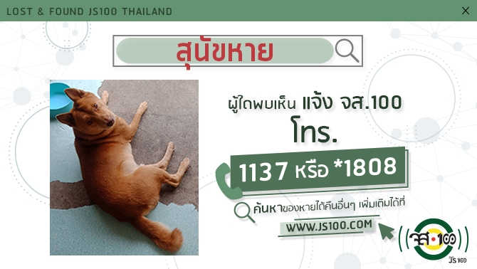 สุนัขหายจากหมู่บ้านการเคหะ10/1 คลอง10 อ.ธัญบุรี จ.ปทุมธานี ผู้ใดพบเห็นแจ้ง JS100 โทร *1808 หรือ 1137