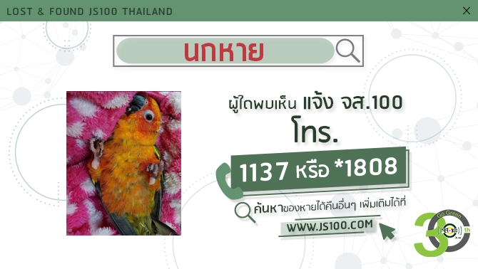 นกหายชื่อ "ก๋วยจั๊บ" พันธุ์ซันคอนัวร์ มีห่วงขาสีส้ม หายจากหมู่บ้านพลับพลา เขตวังทองหลาง กทม. เมื่อวันที่ 24 พ.ค. 65 เวลา 16.00น. ผู้ใดพบเห็นแจ้ง JS100 โทร *1808 หรือ 1137