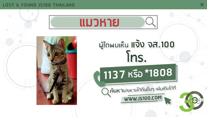 แมวหายชื่อ "ชีต้าห์" พันธุ์ไทย เพศเมีย อายุ 6 เดือน หายจากบ้าน ซ.จรัญสนิทวงศ์ 34 เขตบางกอกน้อย กทม. เมื่อวันที่ 23/06/2022 02:30 น. ผู้ใดพบเห็นแจ้ง JS100 โทร *1808 หรือ 1137