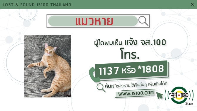 แมวหายชื่อ "ไทเกอร์" พันธุ์ไทย เพศผู้ อายุ 1 ปี 4 เดือน หายจากหมู่บ้านกฤษณา (พระราม 5 - กาญจนาภิเษก) ต.บางคูเวียง อ.บางกรวย จ.นนทบุรี เมื่อวันที่ 4 ต.ค. 65 เวลา 08:00 น. ผู้ใดพบเห็นแจ้ง JS100 โทร *1808 หรือ 1137