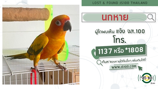 นกหายจากหมู่บ้านลลิลทาวน์ คลอง2 อ.ลำลูกกา จ.ปทุมธานี ผู้ใดพบเห็นแจ้ง JS100 โทร *1808 หรือ 1137