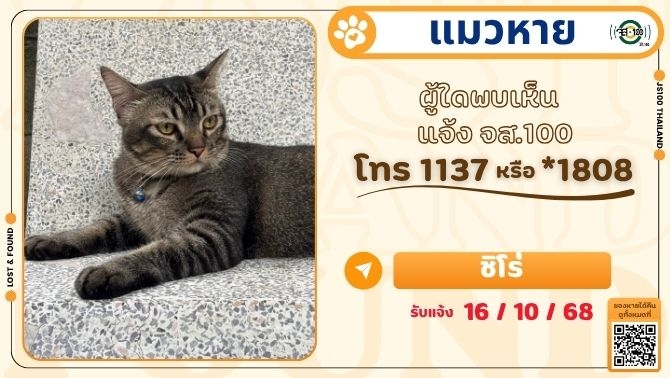 แมวหายชื่อ "ชิโร่" พันธุ์ไทย เพศผู้ สวมปลอกคอสีน้ำเงิน หางยาว ลายสลิดชัด ขนฟู หายจากบริเวณระหว่างซ.พัฒนาการ 22 - 20 เขตสวนหลวง กทม. เมื่อวันที่ 15 ต.ค.68 เวลา 13:00 น. ผู้ใดพบเห็นแจ้ง JS100 โทร *1808 หรือ 1137