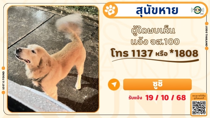 สุนัขหาย ชื่อซูชิ พันธุ์ไทย เพศผู้ อายุ 6 ปี ขนสีน้ำตาล เท้าสีขาว ไม่สวมปลอกคอ หายจาก ซ.รามอินทรา 46 เขตคันนายาว เมื่อวันที่ 16 ต.ค. 68 เวลา 24.00 น. ผู้ใดพบเห็นแจ้ง JS100 โทร *1808 หรือ 1137
