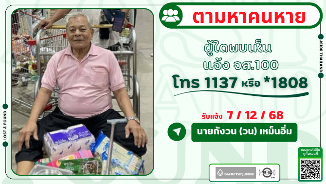 นายกังวน (วน) เหม็นอิ่ม อายุ 78 ปี ผิวขาว สูง 165 ซม. ผมสั้นหงอกขาว มีอาการหลงลืม พูดไม่ชัด เส้นเลือดสมองตีบ ใช้ไม้เท้าสแตนเลสแบบสามขา สวมเสื้อสีแดงคอปก กางเกงเลสีน้ำเงิน ขึ้นรถแท็กซี่สีเหลือง ทะเบียน ทฬ 8086 กทม. หายจากหมู่บ้านพิมลราช 1 ต.พิมลราช อ.บางบัวทอง จ.นนทบุรี เมื่อวันที่ 7 ธ.ค. 68 เวลาประมาณ 08.15 น. ผู้ใดพบเห็นแจ้ง JS100 โทร *1808 หรือ 1137