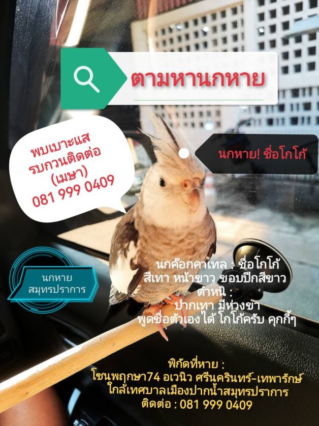 นกหาย ชื่อโกโก้ พันธุ์ค็อกคาเทล เพศผู้ อายุ 1 ปี 3 เดือน มีหงอน หน้าสีขาว ตัวสีเทา ริมปีกสีขาว พูดชื่อตัวเองโกโก้ครับ ร้องคุกกี้ได้ สวมห่วงขาด้านขวา หายจากหมู่บ้านพฤกษา 74/3 อเวนิว ศรีนครินทร์-เทพารักษ์ จ.สมุทรปราการ เมื่อวันที่ 9 ก.พ. 69 เวลาประมาณ 13:00 น. ผู้ใดพบเห็นแจ้ง JS100 โทร *1808 หรือ 1137