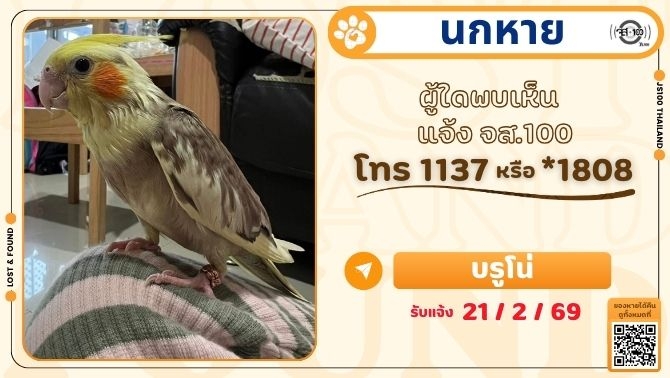 นกหายชื่อ "บรูโน่" พันธุ์ค็อกคาเทล เพศผู้ อายุ 5 เดือน มีห่วงขาข้างซ้ายสลักชื่อบรูโน่และเบอร์โทร น้องจะร้องเพลงคุกกี้และเรียกแม่จ๋า ๆ ได้ หายจากบ้านซ.เทอดไท 96 เขตบางแค กทม. เมื่อวันที่ 20 ก.พ.69 เวลา 06.30 น. ผู้ใดพบเห็นแจ้ง JS100 โทร *1808 หรือ 1137