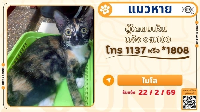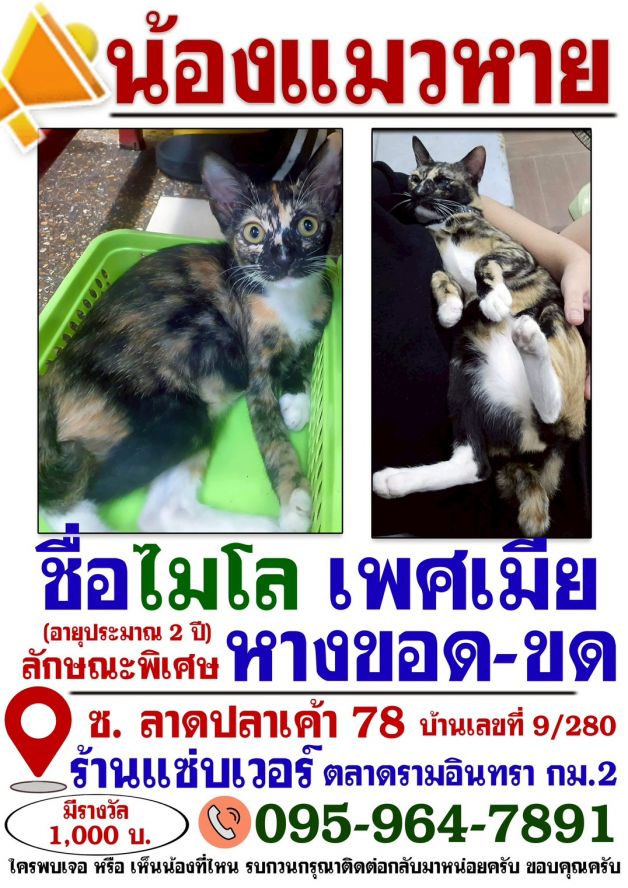 แมวหาย พันธุ์ไทย เพศเมีย ชื่อไมโล อายุ 2.9 ปี ขนสามสี หางขอด หายจากร้านแซ่บเวอร์ ภายในซ.ลาดปลาเค้า78 เขตบางเขน เมื่อวันที่ 19 ก.พ. 69