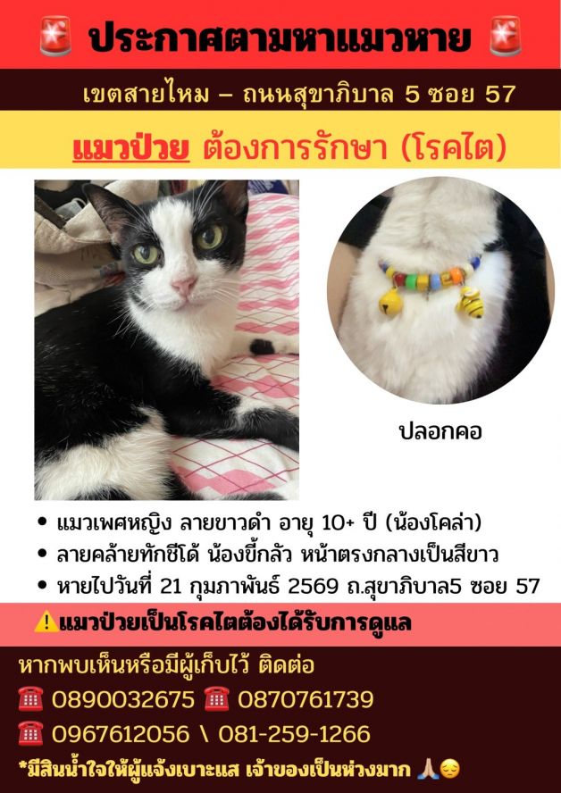 แมวหาย ชื่อโคล่า พันธุ์ไทย เพศเมีย อายุ 10 ปี ตัวสีขาวดำ สวมปลอกคอ หายจากหมู่บ้านแสงธรรม สุขาภิบาล5 ซอย 57 เขตสายไหม กทม. เมื่อวันที่ 21 ก.พ. 69 เวลาประมาณ 10.00 น. ผู้ใดพบเห็นแจ้ง JS100 โทร *1808 หรือ 1137