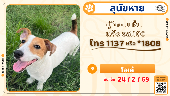 สุนัขหาย พันธุ์แจ็ครัสเซล เพศผู้ ชื่อโอเล่ อายุ 1 ปี 2 เดือน ตัวสูงครึ่งแข้ง ทำหมันแล้ว ตรงตามีสีน้ำตาลทั้ง 2 ข้าง ตรงปลายหางเป็นสีขาว และเป็นสีดำไล่เฉดมาน้ำตาลยันโคนหาง หายจากบริเวณหมู่บ้านวนาแลนด์ ถ.สุวินทวงศ์ อ.เมือง จ.ฉะเชิงเทรา เมื่อวันที่ 28 ม.ค. 69 เวลาประมาณ 17:00 น. ผู้ใดพบเห็นแจ้ง JS100 โทร *1808 หรือ 1137
