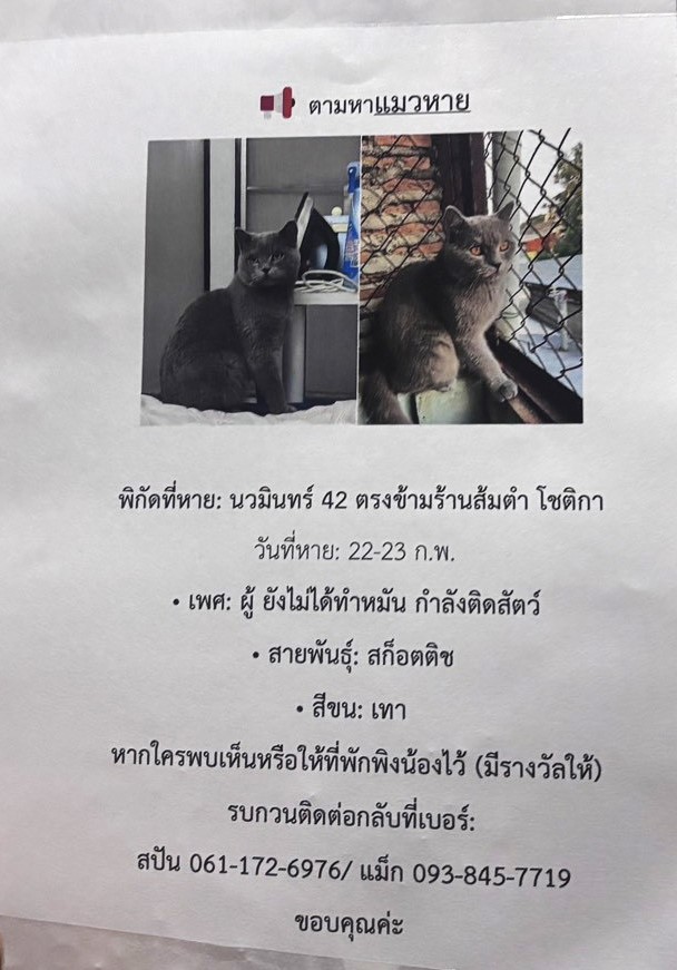แมวหาย ชื่อทูน่า พันธุ์สก็อตติช เพศผู้ อายุ 1 ปี ขนสีเทา ตาสีส้ม ไม่สวมปลอกคอ หายจากบ้าน ซ.นวมินทร์ 42 เขตบึงกุ่ม กทม. เมื่อวันที่ 22 ก.พ. 69 เวลา 20:00 น. ผู้ใดพบเห็นแจ้ง JS100 โทร *1808 หรือ 1137