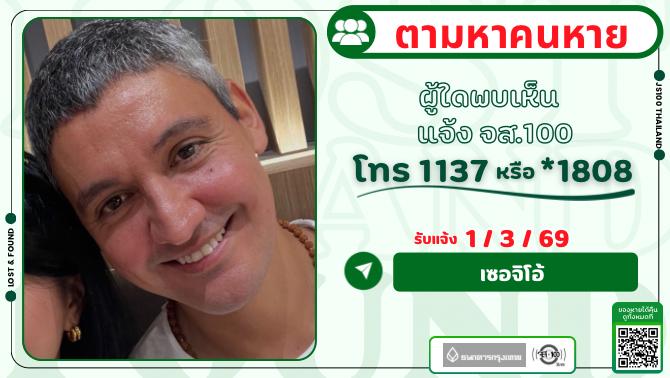 เซอจิโอ้ อายุ 37 ปี ชาวชิลี ผิวแทน สูง 183 ซม. ผมสั้นสกินเฮด รูปร่างผอม สวมเสื้อเชิ้ตสีเทาแขนสั้น กางเกงสามส่วนสีเทา หายจากคอนโดเมทริส พระราม 9 - รามคำแหง เขตบางกะปิ เมื่อวันที่ 28 ก.พ. 69 เวลาประมาณ 16.00 น. ผู้ใดพบเห็นแจ้ง JS100 โทร *1808 หรือ 1137