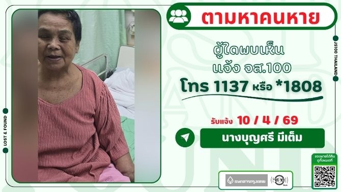 คนหายนาง บุญศรี มีเต็ม อายุ 73 ปี สูง 156 ซม. มีอาการหลงลืม แขน-ขา ซ้ายมีแผลเป็น ขนาดใหญ่ เดินไม่ได้ ต้องใช้วีลแชร์ ไม่ทราบการแต่งกาย คนข้างบ้าน เรียกรถแท็กซี่ สีเหลือง ทะเบียน ทห 7051กทม ให้ไปส่งที่ธนาคารกรุงไทย สาขาสะพานใหม่ (คนข้างบ้าน ไม่ทราบว่าคนหายอาการหลงลืม โดยบอกกับคนข้างบ้านว่า จะไปเบิกเงิน) จึงเรียกรถให้ หายจากหมู่บ้านมั่นคง ซ.เพิ่มสิน 13/1 เขตสายไหม กทม. วันที่ 10 เม.ย.69 เวลา 14.46 น. ผู้ใดพบเห็นแจ้ง JS100 โทร *1808 หรือ 1137