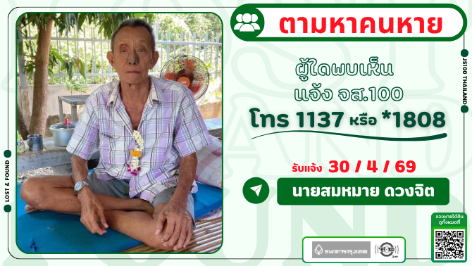 นายสมหมาย ดวงจิต อายุ 86 ปี สูง 170 ซม. รูปร่างสันทัด ผมเกรียนสีขาว ผมน้อย ความจำยังดี ขาขวากะเผลก ไม่ทราบการแต่งกาย หายจากบ้าน หมู่ 6 ต.องครักษ์ อ.โพธิ์ทอง จ.อ่างทอง เมื่อวันที่ 30 เม.ย. 69 เวลาประมาณ 05.00 น. ผู้ใดพบเห็นแจ้ง JS100 โทร *1808 หรือ 1137
