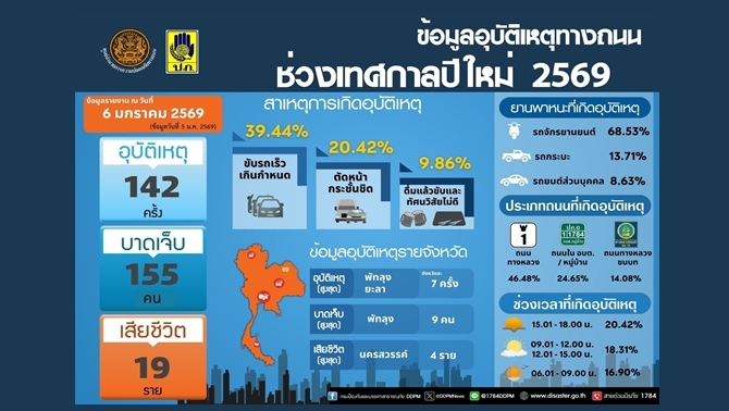 ศปถ.สรุป7 วันอันตรายปีใหม่ 69 เกิดอุบัติเหตุ1,511 ครั้ง เสียชีวิต 272 คน กทม.มากสุด22 คน สาเหตุหลักขับรถเร็วเกินกำหนด
