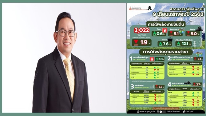 9 เดือนปี 68 (ม.ค.-ก.ย. 68) ไทยใช้พลังงานเชิงพาณิชย์ลดลงร้อยละ1.9