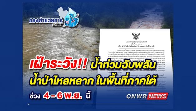 กองอำนวยการน้ำแห่งชาติ (กอนช.) ประกาศฉบับที่ 52/2565 เมื่อวันที่ 2 พ.ย.65 เฝ้าระวังน้ำท่วมฉับพลัน น้ำป่าไหลหลาก ในพื้นที่ภาคใต้ ในช่วงวันที่ 4-6 พ.ย.65 ได้แก่