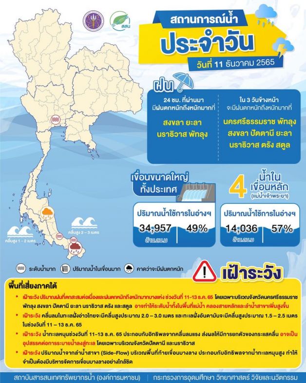 กองอำนวยการน้ำแห่งชาติ(กอนช.) ให้ข้อมูลสถานการณ์ฝนและปริมาณน้ำในพื้นที่ภาคใต้ ว่ายังต้องเฝ้าระวังฝนที่ตกสะสมต่อเนื่องและฝนตกหนักมากบางแห่งช่วงวันที่ 11-13 ธ.ค.65 โดยเฉพาะจ.นครศรีธรรมราช พัทลุง สงขลา ปัตตานี ยะลา นราธิวาส ตรัง และสตูล อาจทำให้ระดับน้ำทั้งในพื้นที่แม่น้ำ คลองสายหลักและลำน้ำสาขาเพิ่มสูงขึ้น