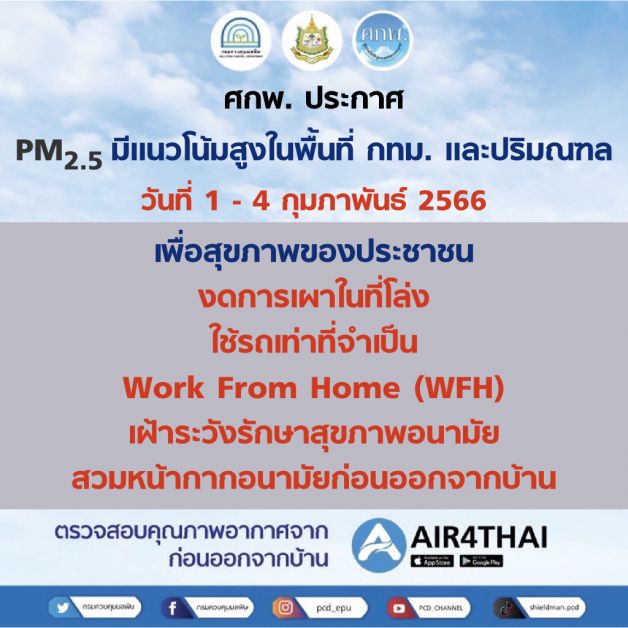 ศูนย์แก้ไขปัญหามลพิษทางอากาศ ประกาศว่า PM 2.5.มีแนวโน้มสูงในพื้นที่ กรุงเทพฯและปริมณฑล วันที่ 1-4 ก.พ.66 เพื่อสุขภาพของประชาชน